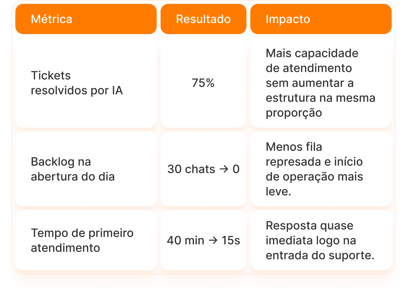 • Enquanto a IA absorvia dúvidas recorrentes e triagens iniciais, o time humano ficou mais focado em casos que exigiam análise, contexto e maior profundidade.