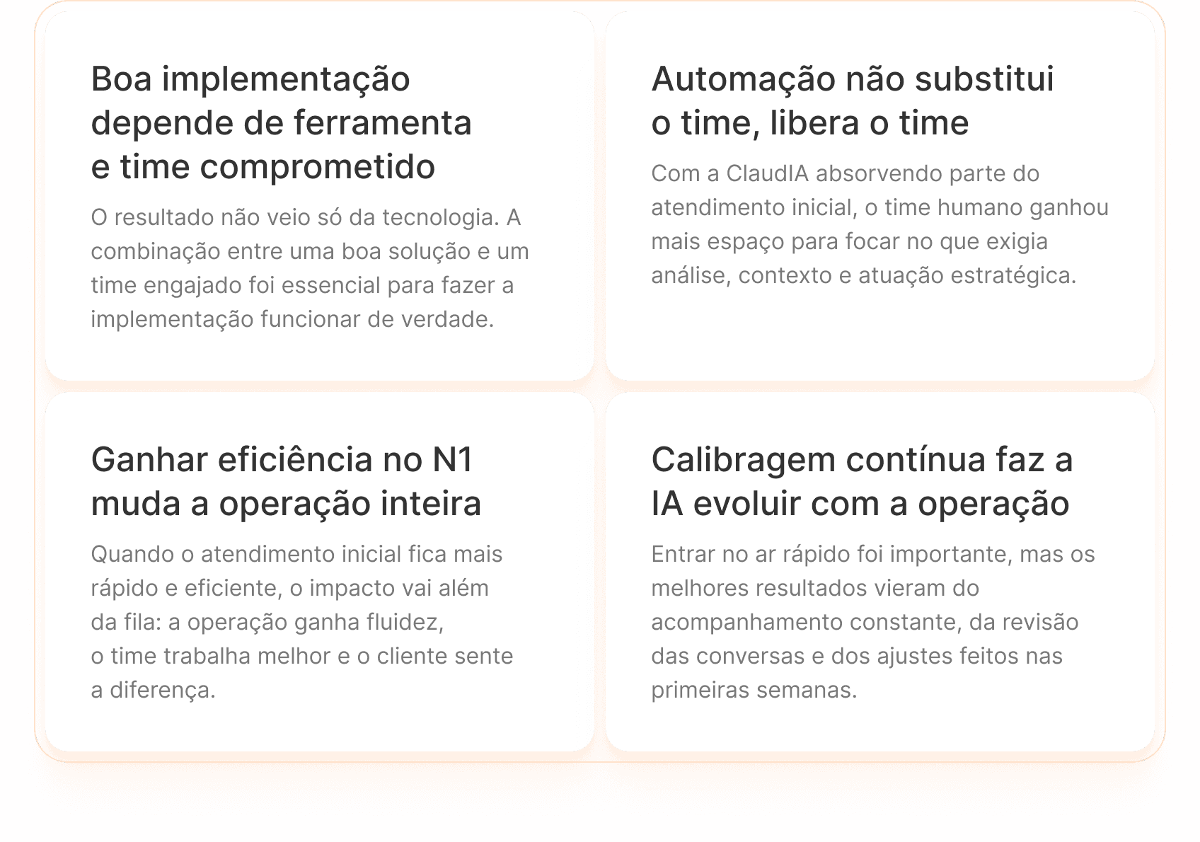Mais do que um projeto de implantação, a entrada da ClaudIA foi tratada como um processo de evolução operacional. O setup foi rápido, mas os resultados vieram da combinação entre base bem estruturada, calibragem constante e envolvimento direto de quem conhecia a rotina do suporte.