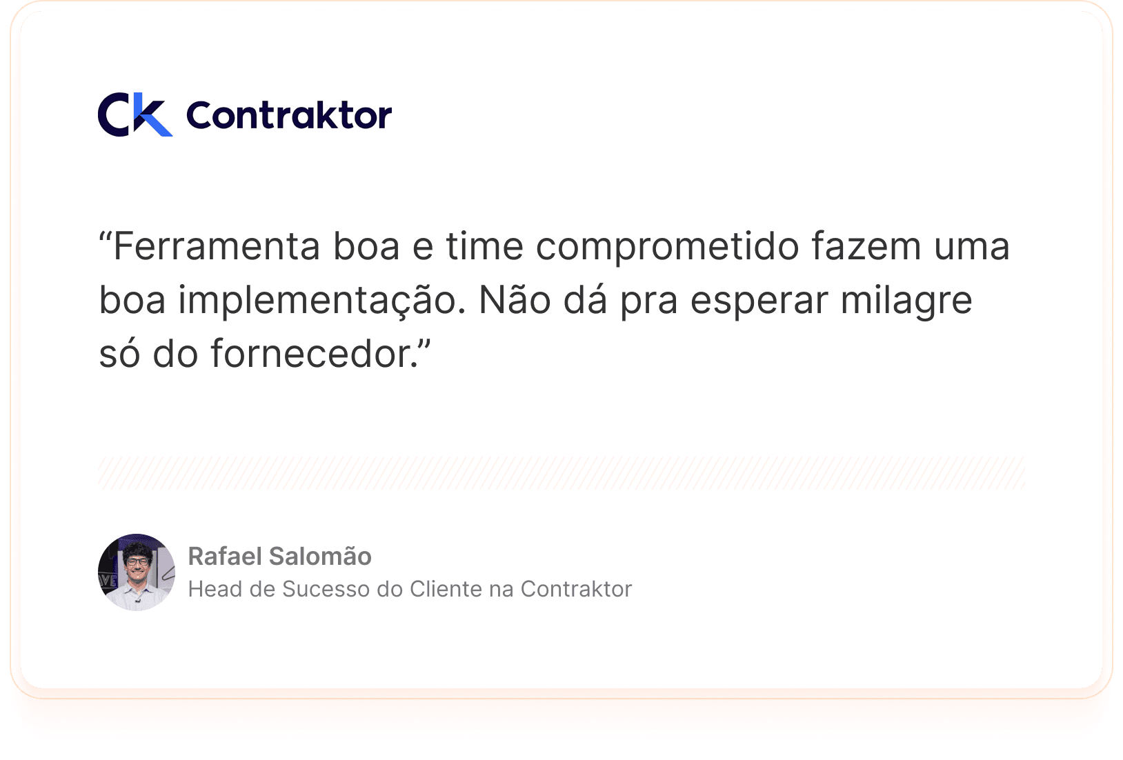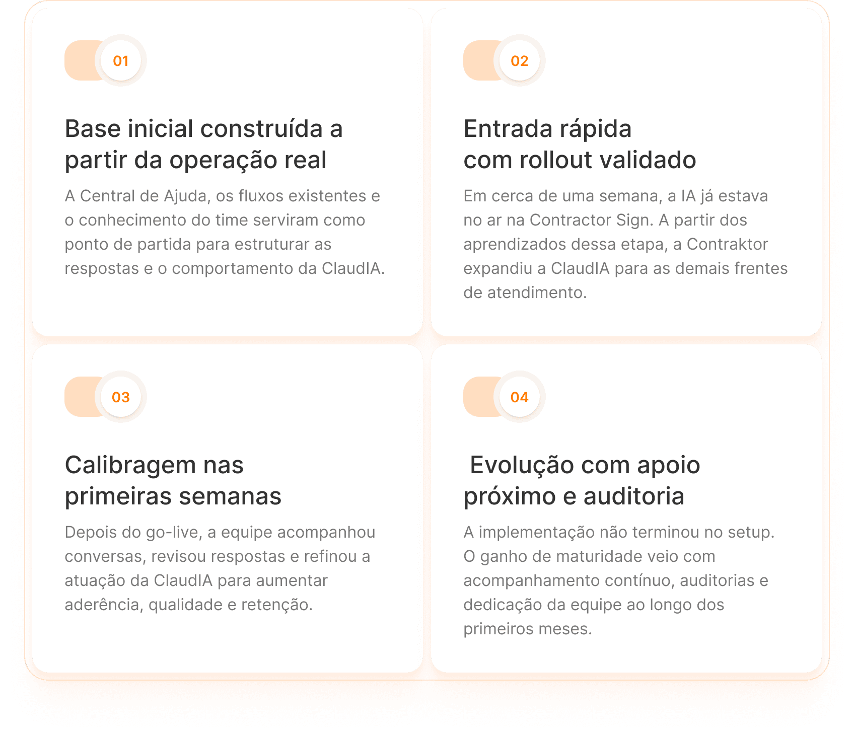 Não. A implementação entrou no ar rapidamente e se apoiou em uma base que a Contraktor já tinha, como conteúdos de suporte e fluxos da operação. O ganho de maturidade veio com calibragem contínua nas semanas seguintes.