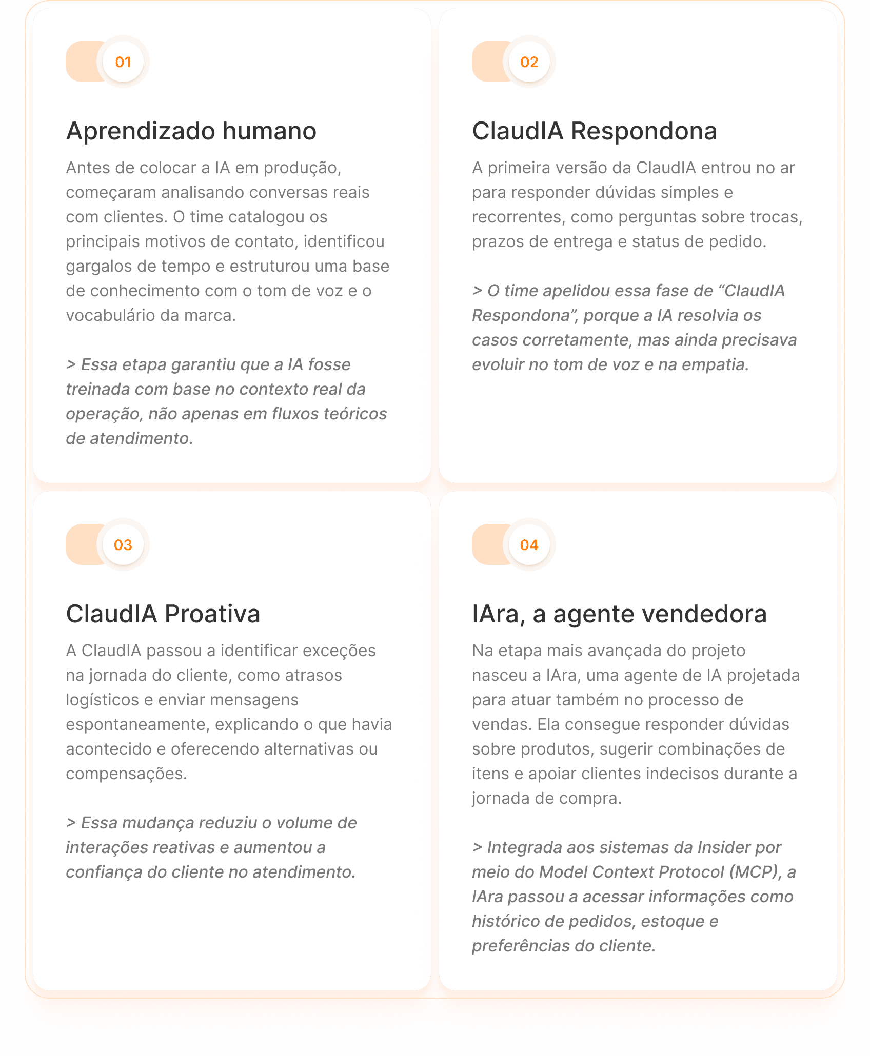 Cada etapa ampliou o papel da IA dentro da operação, começando pelo aprendizado com interações reais e evoluindo até a criação de uma agente capaz de apoiar também o processo de vendas.