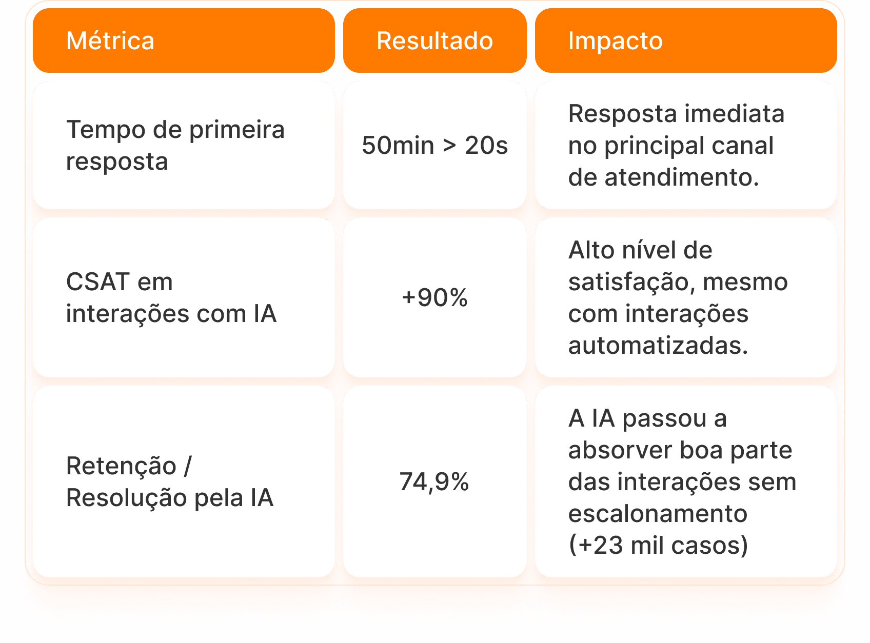 O tempo de primeira resposta caiu de picos superiores a 50 minutos para menos de 20 segundos após a introdução da IA no atendimento.