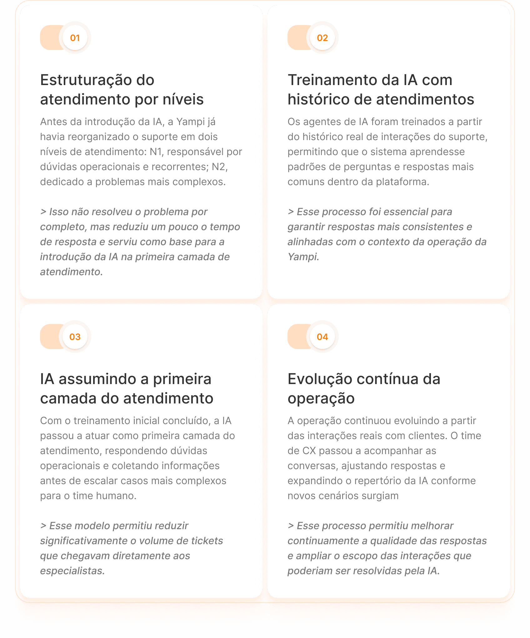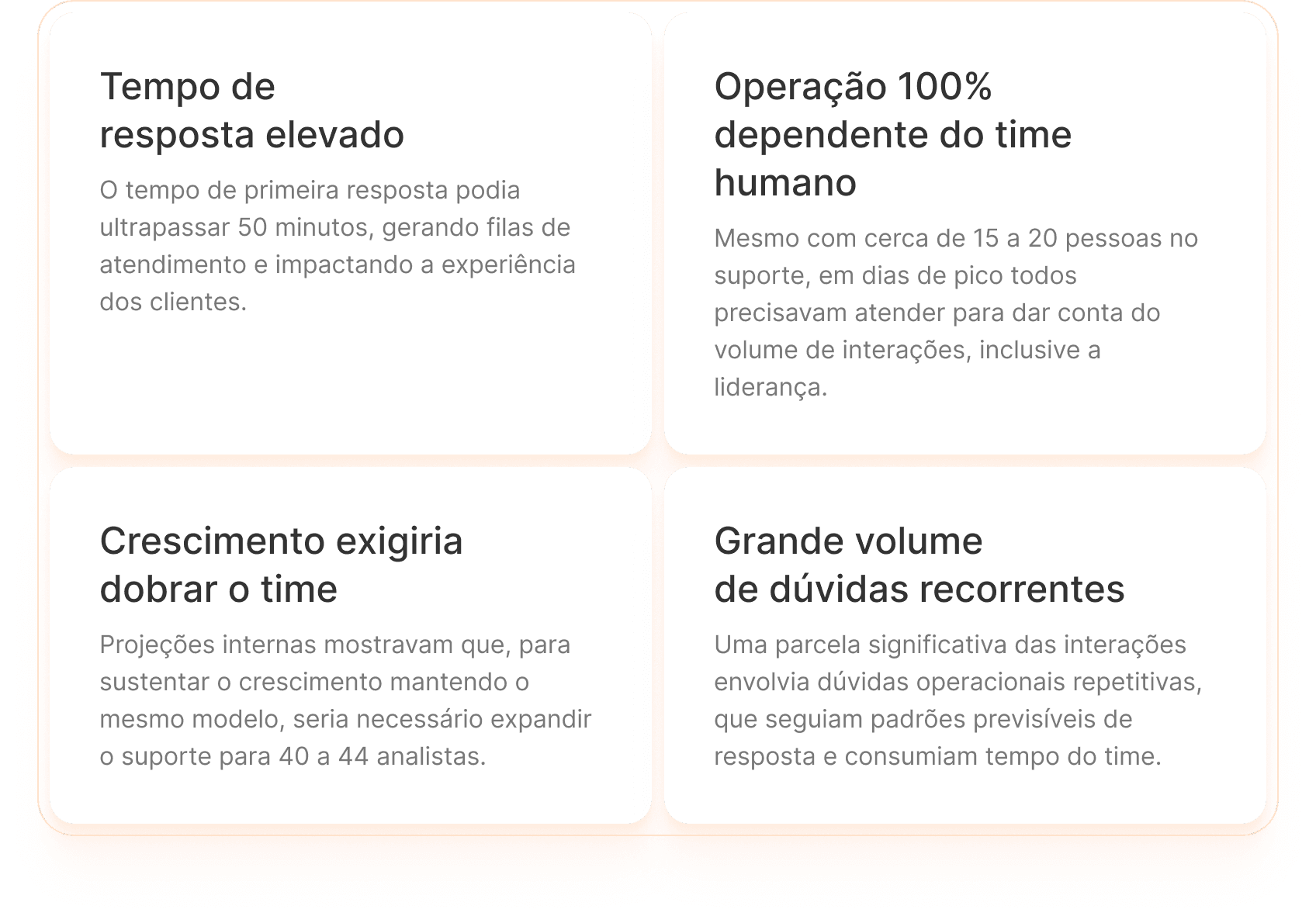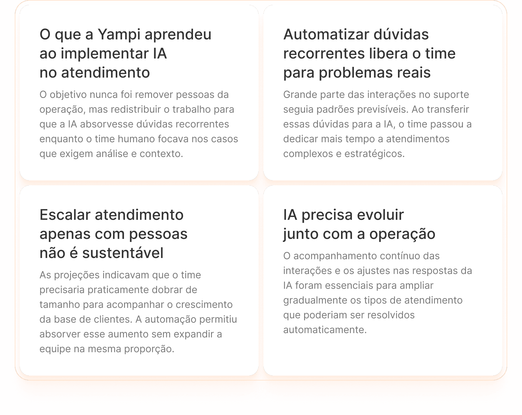 O desafio da Yampi não era apenas responder mais rápido. Era encontrar uma forma de absorver o crescimento da base de clientes sem depender do aumento proporcional do time, mantendo a qualidade da experiência e liberando os especialistas para interações que realmente exigiam contexto humano.